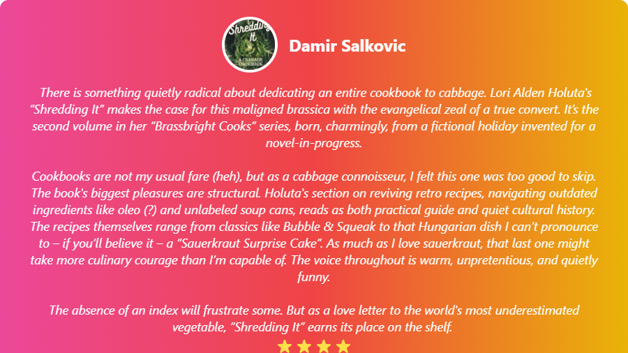 I became obsessed with cookbooks during the Plague, and am a vegetarian, AND love Brassbright, so I was predisposed to like SHREDDED. I have not been disappointed so far. Recipes are simple, easily-adapted to vegetarian or vegan diets, and run the gamut from comfortably familiar (Basic Sauerkraut) to “easy-but-unusual” (Magic Ramen Salad). Thanks for another winner, Lori! — Ray, R.N.